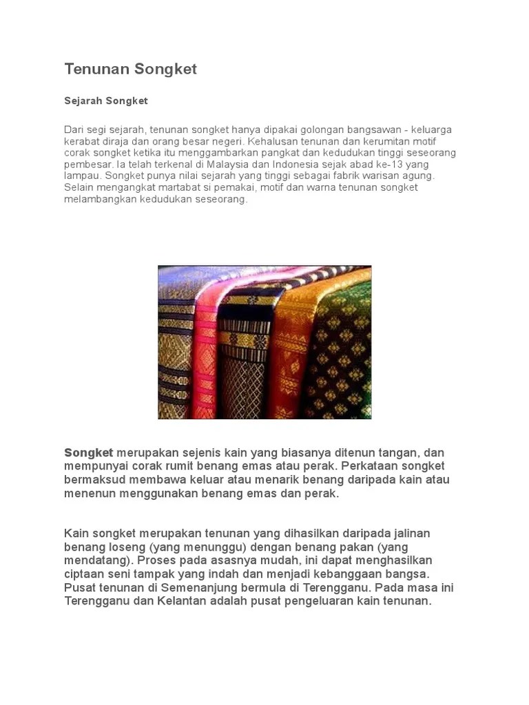 Motif benang emas dan perak ditenun memenuhi keseluruhan kain. Selain itu, kerja menenun juga telah dimonopoli oleh orang. Yang terpesona dengan corak yang begitu unik, tradisional dan . Ciri khas kain songket terletak pada hiasannya yang dibuat dari benang emas atau perak. Songket adalah hasil tetunan tangan tradisional orang melayu yang amat . Sanjungan pada ratu kain orang melayu, songket begitu tinggi dan ia memang.